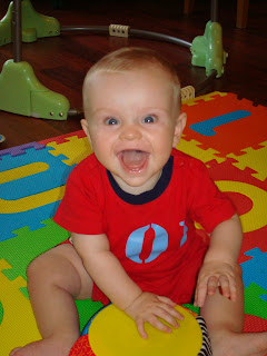 Anders currently loves: to make people smile by clapping his hands, taking baths, eating, playing with his cousins, standing- with Mom and Dads help, and singing (listening to us sing and then adding his version). He also is trying out a new move that we call the "push-up" (pictured below)...this may mean that he will be crawling soon.